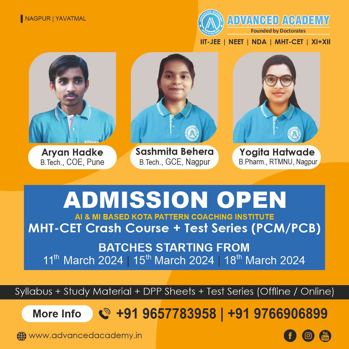 ADVANCED ACADEMY, NAGPUR is going to start MHT-CET Crash Course Batches from 15th March and 18th March. For more details, feel free to call on 9657783958.