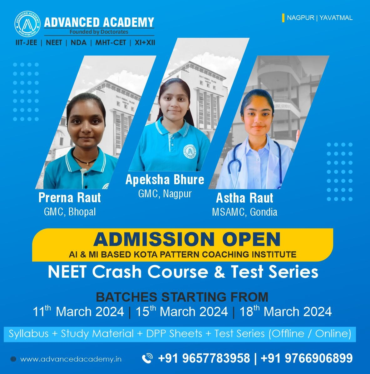 ADVANCED ACADEMY, NAGPUR is going to start NEET Crash Course Batches from 15th March and 18th March. For more details, feel free to call on 9657783958.