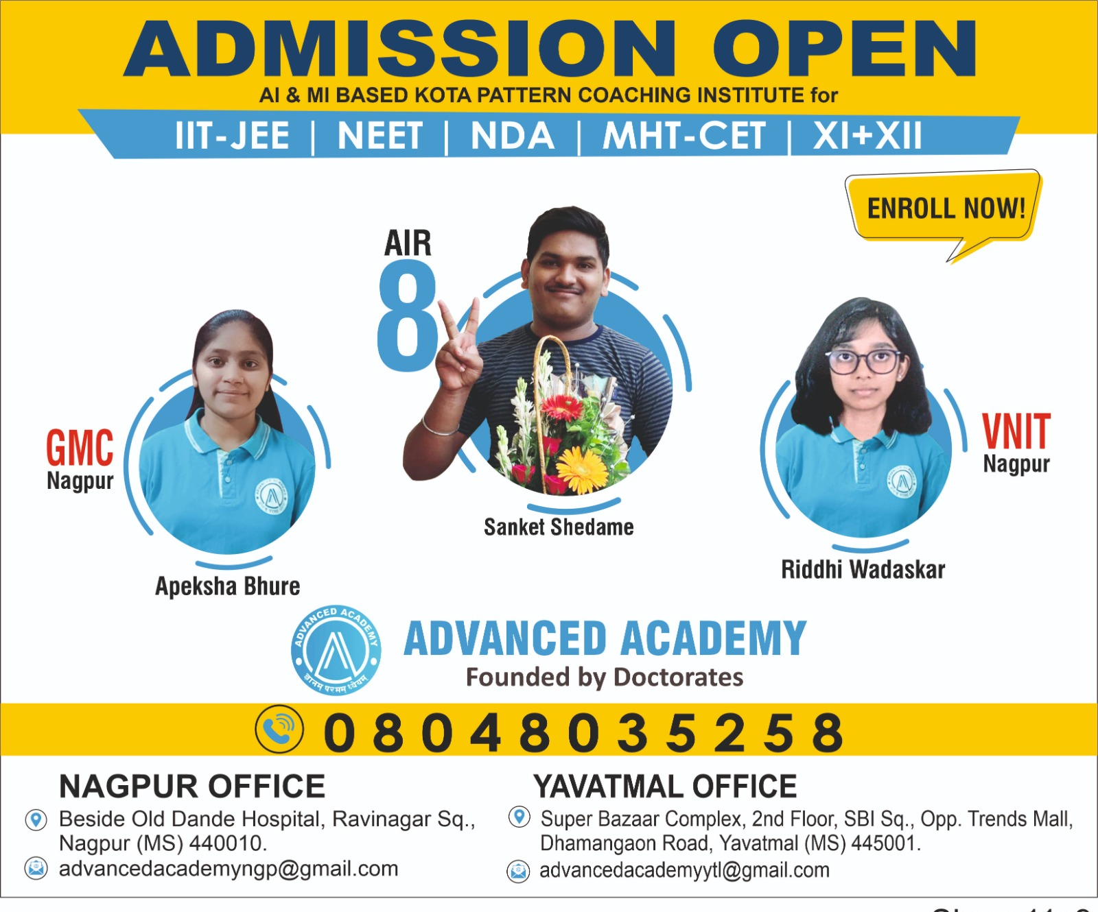 ADVANCED ACADEMY, NAGPUR & YAVATMAL is going to start TWO YEARS REGULAR PROGRAM FOR IIT-JEE, NEET, MHT-CET & XI+XII from 15TH APRIL 2024. For more details, feel free to call on 9657783958.