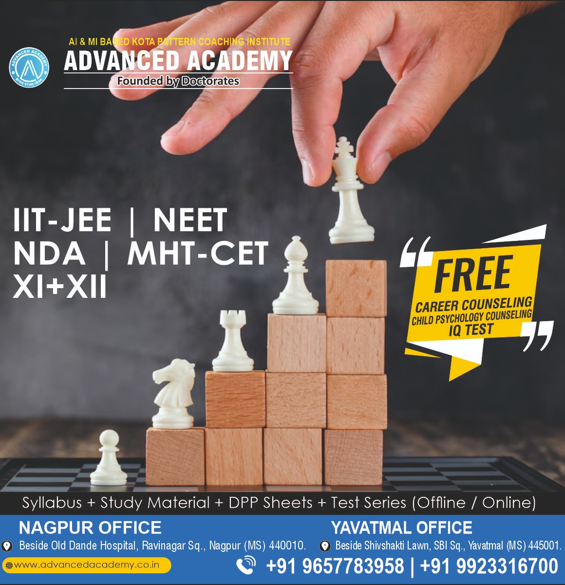 *Dear Parents & Students, * *Admissions (2024)* are open for following Courses  JEE (Main + Advanced) - 2 Years Program  NEET - 2 Years Program  MHT-CET - 2 Years Program  NDA - 2 Years Program  11th + 12th Board - 2 Years Program  NEET Repeaters - 1 Year Program  JEE Repeaters - 1 Year Program  MHT-CET Repeaters - 1 Year Program *Salient Features:*  Complete Kota Pattern Based Coaching  Up to 100 % Scholarship on Total Fees  Result Oriented Small Batches  Excellent Infrastructure  Highly Experienced and Doctorate Faculties  Printed Study Materials  Personal Doubt Clearing sessions  Every Sunday Test  Library Facility for Self Study  AI Based Google App & Online Test Portal  Reasonable Fees  Free IQ Test  Free Child Psychology Counseling  Free Career Counseling Thanks with regards, *ADVANCED ACADEMY, * (9657783958) *Nagpur Branch:* Beside Old Dande Hospital, Ravinagar Square, Nagpur 440010 *Yavatmal Branch:* Beside Shivshakti Lawn, SBI Square, Yavatmal 445001